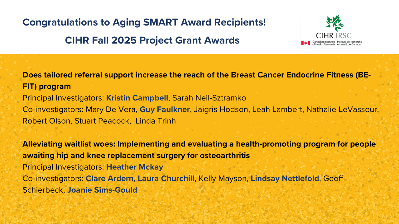 We are a multi-disciplinary collaboration of researchers led by Co-Directors, Dr. Teresa Liu-Ambrose and Dr. Janice Eng.